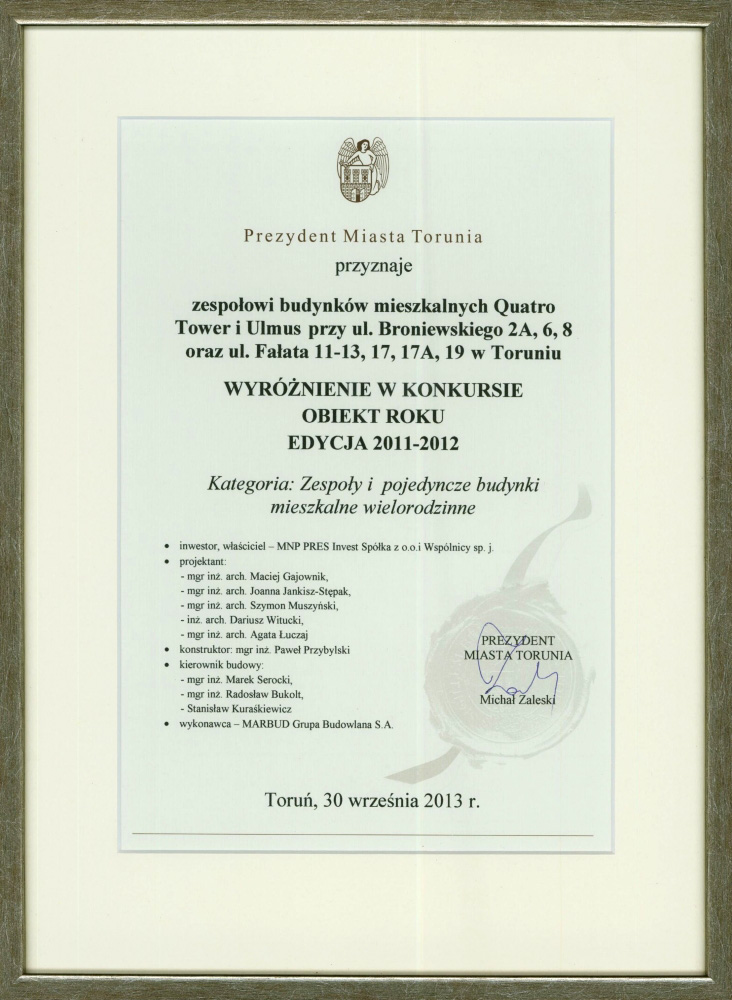 Miło nam poinformować, że Prezydent Miasta Torunia przyznał dla firmy MNP PRES Invest wyróżnienie w Konkursie Obiekt Roku Edycja 2011 - 2012 w kategorii Zespoły i pojedyncze budynki mieszkalne wielorodzinne dla budynków Quatro Tower i Ulmus przy ul. Broniewskiego i Fałata w Toruniu wchodzących w skład budowanego Osiedla Sztuk Pięknych.