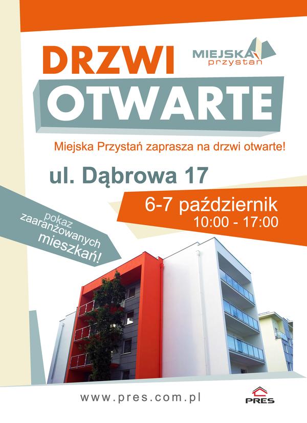 Już w najbliższy weekend, 6-7 października w godzinach od 10.00-17.00, serdecznie zapraszam na drzwi otwarte w nowej inwestycji " Miejska Przystań" przy ul. Dąbrowa 17. Właśnie w tych dniach, zaprezentujemy Państwu trzy mieszkania, które zostały już kompletnie wyposażone i urządzone. W trakcie drzwi otwartych będzie możliwość poznania oferty mieszkaniowej firmy Pres. Dla Państwa będą też dostępni fachowcy z zakresu bankowości - kredyty mieszkaniowe, jak i aranżacji wnętrz.